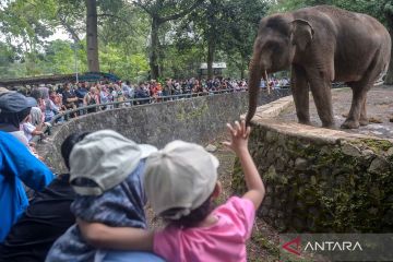 Pengunjung melihat gajah Sumatera (Elephas maximus sumatranus) saat berwisata di Taman Margasatwa Ragunan, Jakarta, Minggu (22/3/2026). Pengelola Taman Margasatwa Ragunan mencatat jumlah pengunjung pada hari kedua Idul Fitri 1447 H hingga pukul 12.00 WIB mencapai 43.348 orang dan ditargetkan mencapai 400.000 orang selama masa libur Lebaran. ANTARA FOTO/Putra M. Akbar/nym.