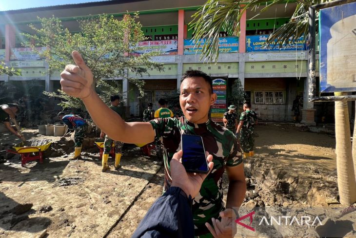 Komandan Tim (Dantim) 1 SST 3 Yon Zipur 10/Jaladri Palaka Divisi 2/Infanteri Kostrad Letda Cke Yudha Bahtiar menjawab pertanyaan ANTARA ditemui di sela kegiatan membersihkan lumpur di SD Negeri 1 Kuala Simpang, Aceh Tamiang, Sabtu (25/1/2026). ANTARA/HariantoMeski begitu, dia menegaskan kondisi tersebut tidak menyurutkan semangat personel, pihaknya tetap bekerja maksimal tanpa merusak bangunan, memilih jalur normal pembersihan, serta menggunakan peralatan yang telah disiapkan komando atas untuk mengeluarkan lumpur secara bertahap.
