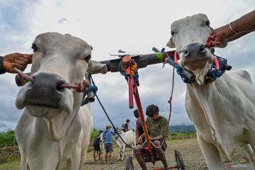Sejumlah tim peserta memacu sapinya pada balap sapi atau Posilumba Japi di Desa Baliase, Sigi, Sulawesi Tengah, Minggu (11/1/2026). Balap sapi yang memperebutkan hadiah ternak sapi itu sudah menjadi tradisi bagi warga setempat setiap usai panen dan digelar sebagai ungkapan syukur sekaligus mempererat silaturahmi antarwarga. ANTARA FOTO/Basri Marzuki/YU
