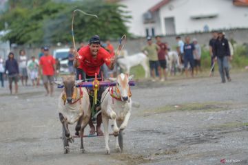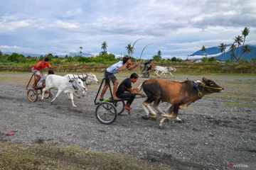 Tradisi balap sapi di Sigi. Salah satu tim peserta mengarahkan sapi untuk melakukan start pada balap sapi atau Posilumba Japi di Desa Baliase, Sigi, Sulawesi Tengah, Minggu (11/1/2026). Balap sapi yang memperebutkan hadiah ternak sapi itu sudah menjadi tradisi bagi warga setempat setiap usai panen dan digelar sebagai ungkapan syukur sekaligus mempererat silaturahmi antarwarga. ANTARA FOTO/Basri Marzuki/YU