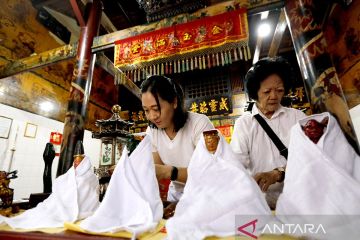 Sejumlah umat Tridharma mencuci arca di Kelenteng Tulus Harapan Kita di Kota Gorontalo, Gorontalo, Minggu (8/2/2026). Cuci arca merupakan ritual penyucian patung dewa-dewi yang melambangkan pembersihan diri dan hati agar suci dan tulus dalam menyambut tahun baru Imlek. ANTARA FOTO/Adiwinata Solihin/rwa.