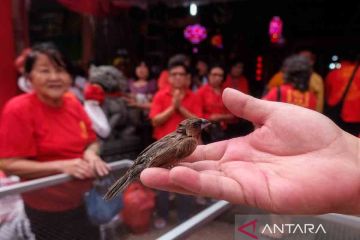 Peserta dipimpin bhikku melepaskan burung pipit pada rangkaian tradisi Pao Oen di halaman Klenteng Tien Kok Sie, Pasar Gede, Solo, Jawa Tengah, Minggu (8/2/2026). Pengelola klenteng setempat menggelar tradisi Pao Oen sebagai wujud penyatuan dengan alam dan proses penyucian diri untuk menyambut perayaan tahun baru Imlek. ANTARAFOTO/Maulana Surya/rwa.