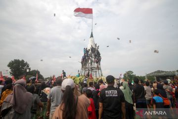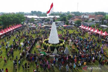 Warga melihat tumpeng tempe saat ruwat desa di Lapangan Desa Sedenganmijen, Krian, Sidoarjo, Jawa Timur, Minggu (1/2/2026). Tradisi ruwat desa dengan membuat tumpeng tempe setinggi 9 meter yang diselenggarakan setiap tahun menjelang bulan suci Ramadhan tersebut menjadi ajang sedekah dan sebagai bentuk rasa syukur para perajin tempe kepada Tuhan YME atas limpahan rezeki. ANTARA FOTO/Umarul Faruq/aww.